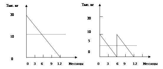 СБ Тыс. шт. Рис. 5.4. Метод сопоставления предельных показателей на примере фирмы "Б". Вопросы для самопроверки. 1. Назовите методы, позволяющие определить оптимальный объем производства и сбыта продукции. 2. Какие допущения необходимо принять во внимание при решении задачи определения оптимального объема производства? 3. Перечислите виды издержек, необходимых при использовании методов оптимизации. 4. Раскройте сущность метода сопоставления валовых показателей. 5. Перечислите показатели, используемые методом сопоставления валовых показателей. 6. Дайте графическую интерпретацию метода сопоставления валовых показателей. 7. Раскройте сущность метода сопоставления предельных показателей. 8. Перечислите основные показатели, используемые методом сопоставления предельных показателей. 9. Дайте графическую интерпретацию метода сопоставления предельных показателей. 10. Охарактеризуйте стратегические направления деятельности предприятия в случае падения рыночной цены продукции. 11. Раскройте особенности использования метода сопоставления валовых показателей при определении оптимального объема производства и сбыта в условиях монополии. 12. Раскройте особенности использования метода сопоставления предельных показателей в условиях монополии. 6. РАСЧЕТ ИЗДЕРЖЕК ПРИ УПРАВЛЕНИИ ПРОИЗВОДСТВЕННЫМ СНАБЖЕНИЕМ И СЕРИЙНЫМ ПРОИЗВОДСТВОМ. Основной функцией управления снабжением производственного предприятия является обеспечение наличия необходимых материалов (сырья, тары и т.д.) в момент, когда в них, согласно производственным планам, возникает потребность. Основной функцией управления производственным процессом является обеспечение наличия готовой продукции к тому моменту, когда она должна быть поставлена заказчику. На практике невозможно обеспечить такую степень координации снабженческих, производственных и сбытовых планов, чтобы сырье поступало в тот момент, когда оно включается в процесс производства, и чтобы производственный цикл заканчивался именно тогда, когда готовая продукция должна быть отправлена заказчику. Поэтому необходимо планировать создание запасов сырья и материалов (производственный запас) и запаса готовой продукции. 6.1. Определение оптимальной величины партии закупаемых товаров. Рассмотрим пример, в котором предприятие в следующем году должно закупить 20000 кг определенного вида сырья. Если все 20000 кг закупаются одновременно, производственный запас непосредственно после закупки составит 20000 кг, затем он постепенно будет использоваться. По прошествии года запас будет равен нулю. Среднегодовой производственный запас в таком в таком случае составит 10000 = ((20000 +0)/2). Если закупать сырье два раза в год, т.е. по 10000 каждая, среднегодовой запас составит 5000 кг = ((10000+0)/2). Это отношение проиллюстрировано на рис.6.1, где пунктирными линиями показаны значения среднегодового запаса. Таким образом, чем больше партия закупаемого сырья, тем больше величина среднегодового запаса и тем больше величина издержек по складированию (уплата процентов, потери при хранении, арендная плата за складские помещения и т.д.). Если фирма не несет издержек связанных с размещением заказа на поставки сырья и доставкой закупаемой партии, то экономически эффективно закупать сырье мелкими партиями, чтобы минимизировать издержки по складировани
