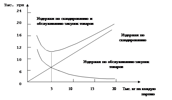 На основании расчетов, выполненных в таблице 6.1, выбор оптимального количества закупаемых партий основывается на выполнении расчетов для определенного количества альтернативных показателей числа закупаемых партий и последующего выбора величины партии, с которой связаны минимальные издержки по складированию и обслуживанию закупок. Рис.6.2 иллюстрирует расчеты, приведенные в табл.6.1. При построении графика дополнительно включен показатель величины закупаемой партии 2000 кг. Оптимальное значение величины закупаемой партии находится в точке пересечения кривой издержек по складированию с кривой издержек по обслуживанию закупок.
