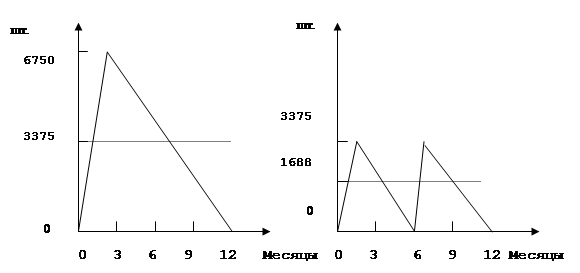 r - издержки на складирование в процентах от стоимости среднего годового производственного запаса. Выражается в виде десятичной дроби, например 10% = 0,1. Подставив значения из нашего примера, получим следующее: Рассчитанная величина закупаемой партии показывает, что фирма должна делать 4 = (20000 / 5000) закупки сырья и материалов в год. 6.2. Определение оптимальной величины серии. Определение оптимальной величины серии выпускаемой продукции осуществляется на тех же правилах, что и при определении оптимальной величины закупаемой партии сырья и материалов. Если производить товар большим количеством мелких серий, издержки по складированию будут сведены к минимуму. При этом существенными будут издержки по подготовке производства (переналадка оборудования, его запуск и т.п.), которые составляют примерно одинаковую величину на каждую серию. Рассмотрим пример с долговременным производственным циклом и рассчитаем для него величину среднегодового запаса. В качестве примера возьмем промышленное предприятие, имеющее следующие производственные показатели по одному из выпускаемых им товаров: В год В месяц Максимально возможный объем производства . . 36000 3000 Объем реализации . . . . . . . . . . . . . . . . . . . . . . . . . 9000 750 Если решено производить все 9000 шт. одной серией, производственный цикл займет 3 месяца. По окончании этого периода запас готовой продукции достигнет своего максимума и составит: Объем производства за 3 месяца . . . . . . . . . . . . . . . 9000 шт. - Объем реализации за 3 месяца . . . . . . . . . . . . . . . . 2250 шт. - Запас готовой продукции на конец 3-го месяца . . . 6750 шт. В рассматриваемом периоде минимальный запас составляет 0 шт., а максимальный запас – 6750 шт., среднегодовой запас готовой продукции равен 3375 шт. = (6750 + 0) / 2. Если принято решение производить 4500 шт. в одной серии, производственный цикл будет продолжаться 1,5 месяца. Объем реализации за этот период составит 1125 шт. Максимальный запас теперь составит 3375 шт., а среднегодовой – 1688 шт. В этих условиях среднегодовой запас готовой продукции составляет 37,5% от величины серии. Эта зависимость отражена на рис. 6.3. Пунктирные линии показывают значения среднегодового запаса.