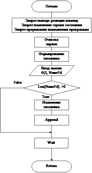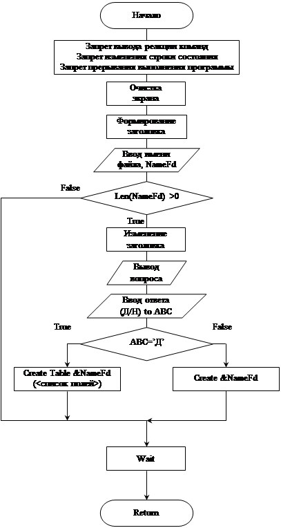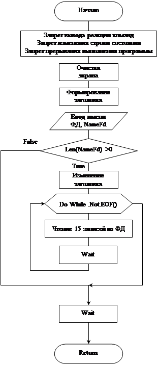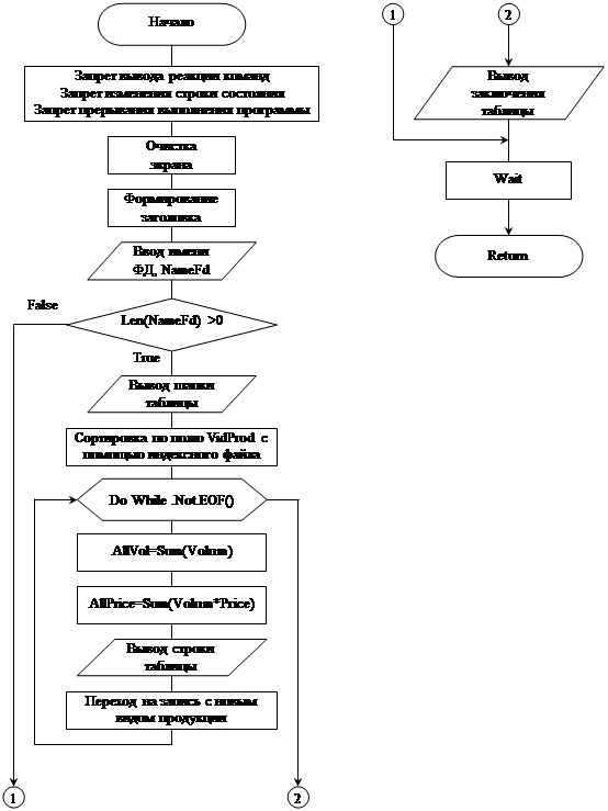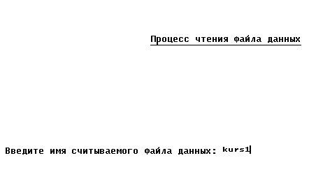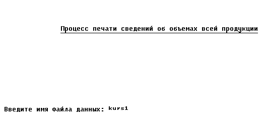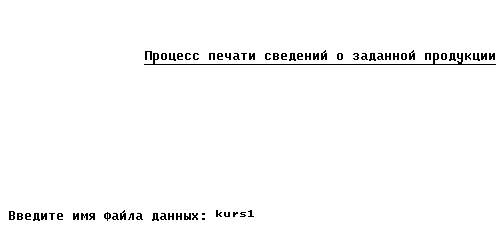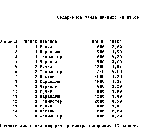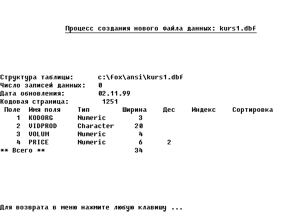 * Изменение заголовка Zag=Zag + ': ' + NameFd + '.dbf' LenZag=Int(Len(Zag)) @ 4,Int((80-lenZag)/2) to 4,Int((80-lenZag)/2)+LenZag Color u/w* @ 3,Int((80-LenZag)/2) Say Zag Color u/w* @ 14,0 Text Хотите автоматически создать пустую структуру с указанным именем, по заданию курсового проекта (Д/Н)? EndText * Ответ на поставленный вопрос Do While .T. @ 16,57 Wait '' to ABC && Ожидание нажатия клавиши If ABC='н' Or ABC='д' ABC=Chr(Asc(ABC)-32) && Смена регистра EndIf If ABC='Н' Or ABC='Д' Exit EndIf EndDo * Создание ФД If ABC='Д' && Автоматическое создание ФД Create Table &NameFd ; (KodOrg N(3,0), VidProd C(20), Volum N(4,0), Price N(6,2)) @ 8,0 set Talk on Display Structure && Вывод созданной структуры set Talk off Else && Создание ФД с возможностью заполнения полей Create &NameFd EndIf EndIf * Конец работы @ 24,0 Wait 'Для возврата в меню нажмите любую клавишу ...' @ 24,0 Clear Return 6.3. Чтение файла данных* Командный файл ReadFd - чтение файла данных set Talk off set Status off set Escape off Clear @ 4,27 to 4,54 Color u/w* @ 3,27 Say 'Процесс чтения файла данных' Color u/w* @ 12,0 Accept ' Введите имя считываемого файла данных: ' to NameFd If Len(NameFd) >0 && Если имя файла не ввели, то делать нечего * Изменение заголовка @ 3,0 Clear to 5,79 Zag='Содержимое файла данных: ' + NameFd + '.dbf' LenZag=Int(Len(Zag)) @ 4,Int((80-lenZag)/2) to 4,Int((80-lenZag)/2)+LenZag Color u/w* @ 3,Int((80-LenZag)/2) Say Zag Color u/w*