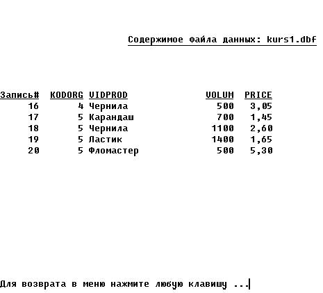 * Формирование строки таблицы @ 9+I,17 Say '|' @ 9+I,19 Say MinVP @ 9+I,39 Say '|' @ 9+I,46 Say MinAP Picture '### ###.##' @ 9+I,61 Say '|' LastAP=MinAP && Предыдущее минимальное значение && (нижняя граница минимальных значений) MinAP=0 GoTo Top && Возобновить просмотр с первой строки Next * Формирование итоговой части таблицы @ 15,17 Say L Close DataBases && Закрытие ФД EndIf * Конец работы @ 24,0 Wait 'Для возврата в меню нажмите любую клавишу ...' @ 24,0 Clear Return 7. Результаты решений