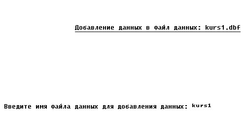 * Обработка выбранного пункта меню Do Case Case L1=0 Exit && Выход в панель главного меню Case L1=1 Do Case Case L2=1 && Выбрано действие 'Создание нового ФД' Do CreateFd Case L2=2 && Выбрано действие 'Чтение данных' Do ReadFd Case L2=3 && Выбрано действие 'Добавление новых данных' Do AddFd EndCase Case L1=2 Do Case Case L2=1 && Выбрано задание №1 из курсового проекта Do Zad1 Case L2=2 && Выбрано задание №2 из курсового проекта Do Zad2 Case L2=3 && Выбрано задание №3 из курсового проекта Do Zad3 EndCase Case L1=3 Do Case Case L2=1 && Выбран пункт 'Выход в Fox' Return Case L2=2 && Выбран пункт 'Выход из Fox' Quit EndCase EndCase EndDo EndDo 6.2. Создание файла данных* Командный файл CreateFd - создание нового файла данных set Talk off set Status off set Escape off Clear Zag='Процесс создания нового файла данных' @ 4,22 to 4,58 Color u/w* @ 3,22 Say Zag Color u/w* @ 12,0 Accept ' Укажите имя создаваемого файла данных: ' to NameFd If Len(NameFd) > 0 && Если имя файла не ввели, то делать нечего