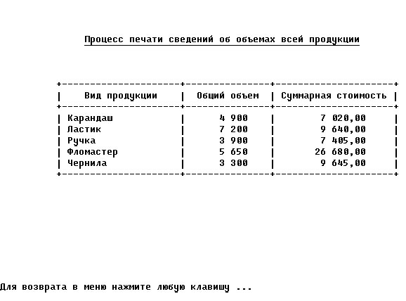 5.6. Печать сведений о суммарной стоимости и суммарном выпуске каждой продукции.