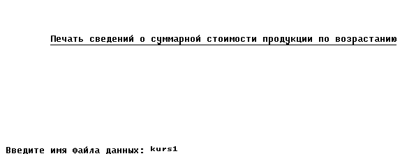 * Формирование шапки таблицы L='+---------------------+---------------+---------------------+' @ 7,10 Say L @ 8,10 Say '| Вид продукции | Общий объем | Суммарная стоимость |' @ 9,10 Say L * Сортировка данных по виду продукции Index On VidProd to &NameFd && Создание индексного файла Use &NameFd Index &NameFd * Формирование строк таблицы Row=10 && Текущий номер строки для вывода данных Do While .Not.EOF() VP=VidProd RNom=RecNo() && Запомнить номер текущей записи Sum Volum For VidProd=VP to AllVol && Общий объем Sum Volum*Price For VidProd=VP to AllPrice && Суммарная стоимость GoTo RNom && Вернуться на текущую запись @ Row,10 Say '|' @ Row,12 Say VidProd @ Row,32 Say '|' @ Row,37 Say AllVol Picture '### ###' @ Row,48 Say '|' @ Row,55 Say AllPrice Picture '### ###.##' @ Row,70 Say '|' * Пропуск записей с отработанным видом продукции Do While VidProd = VP And .Not.EOF() Skip EndDo Row=Row+1 EndDo * Формирование итоговой части таблицы @ Row,10 Say L Close DataBases && Закрытие ФД Delete File NameFd + '.idx' && Удаление индексного файла EndIf * Конец работы @ 24,0 Wait 'Для возврата в меню нажмите любую клавишу ...' @ 24,0 Clear Return 6.7. Печать упорядоченного по суммарной стоимости списка продукции пяти видов* Командный файл Zad3 - печать упорядоченных сведений о стоимости продукции set Talk off set Status off set Escape off Clear @ 4,9 to 4,71 Color u/w* @ 3,9 Say 'Печать сведений о суммарной стоимости продукции по возрастанию' Color u/w* @ 12,0 Accept ' Введите имя файла данных: ' to NameFd @ 12,0 Clear If Len(NameFd) >0 && Если имя файла не ввели, то печатать нечего Use &NameFd