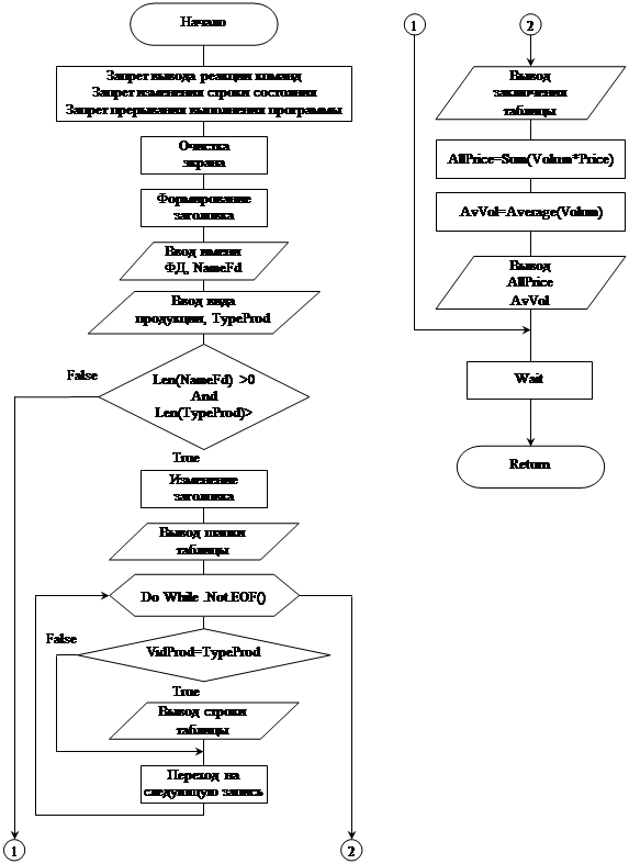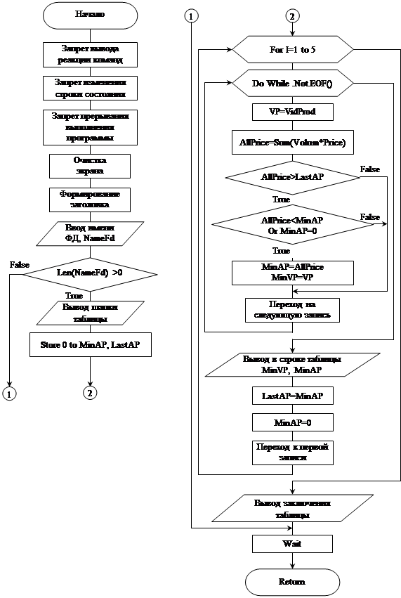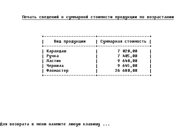 * Формирование шапки таблицы L='+---------------------+---------------------+' @ 7,17 Say L @ 8,17 Say '| Вид продукции | Суммарная стоимость |' @ 9,17 Say L * Поиск продукции с наименьшим значением стоимости Store 0 to MinAP, LastAP For I=1 to 5 && Цикл для пяти видов продукции Do While .Not.EOF() && Цикл поиска нового минимума VP=VidProd && Текущий вид продукции RNom=RecNo() && Текущая запись Sum Volum*Price For VidProd=VP to AllPrice If AllPrice > LastAP If AllPrice < MinAP Or MinAP=0 MinAP=AllPrice MinVP=VP EndIf EndIf If RNom < RecCount() GoTo RNom+1 && Переход на следующую запись EndIf EndDo