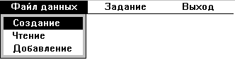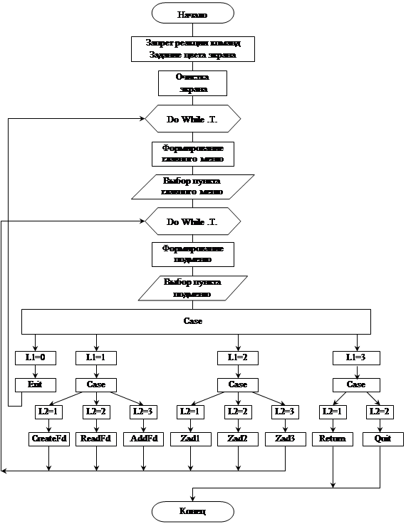 Кроме того, необходимо предоставить пользователю возможность облегчить процесс создания файла данных, т.е. предусмотреть создание файла данных со структурой заданной в программе, а не выбираемой самим пользователем, что полностью исключит возможные ошибки пользователя в задании имен полей файла данных, что в сою очередь может сказаться на корректной работе всей программы. 5. Алгоритмы 5.1. Создание двухуровневого светового меню