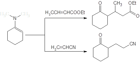 В противоположность алкилированию галогенидами, присоединение по Михаэлю активированных алкенов проходит с высокой специфичностью по атому углерода. Реакция по гетероатому в данном случае оказывается обратимой и сдвиг к термодинамически более стабильному продукту С-алкилирования приводит к хорошим выходам соответствующих алкилпроизводных: