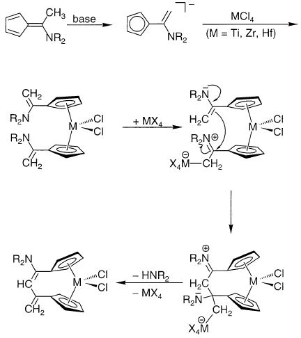 Исследование кинетики реакции рацемизации показало, что содержащие протон асимметрические центры по соседству с иминной группой “долго не живут”. Реакции ароматических енаминов могут катализироваться тетрагалогенидами Ti, Zr, Hf [9]. В качестве любопытного примера реакции алкилирования енамина можно привести осуществленную совсем недавно межлигандную конденсацию [10]: