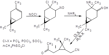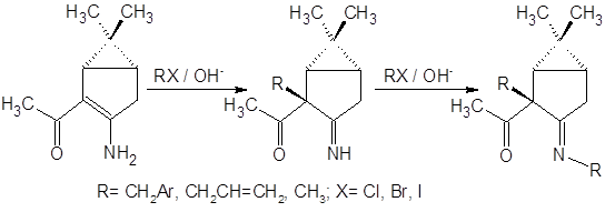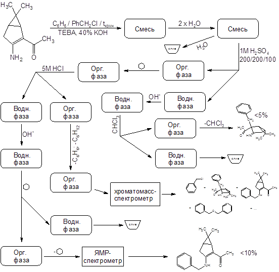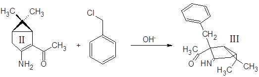 Кетонитрил I (исходное соединение, чистота ~90% (ГЖХ), предоставлен ЛТС НИОХ СО РАН) является производным природного терпена – 3-карена, выделяемого из соснового скипидара: Результирующее соединение IV используется далее в синтезе оптически активных комплексных соединений, используемых в асимметрическом катализе. Кетонитрил I представляет собой вязкую темную жидкость, растворимую в органических растворителях и нерастворимую в воде. Реакция (а) проходит гладко и с высоким выходом (~80%) дает продукт конденсации – (3-амино-6,6-диметилбицикло[3.1.0]гекс-2-ен-2-ил)метилкетон II. Отдельного рассмотрения заслуживает процесс бензилирования соединения II. Эта реакция при комнатной температуре протекает крайне неоднозначно, с выходом целевого продукта менее 10% и образованием трудноразделимой смеси изомерных продуктов и продуктов полиалкилирования. Схема превращений и идентифицированные продукты представлены на следующем рисунке: