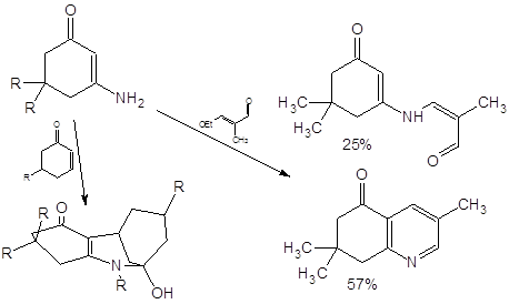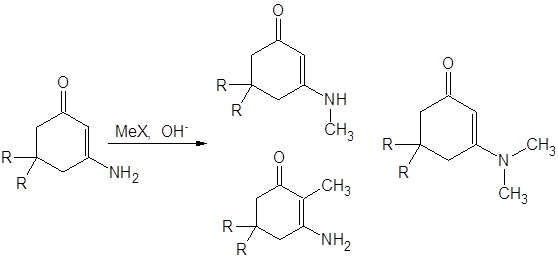β-енаминокетоны. Один из наиболее удобных синтетических методов получения сложных енаминонов, в том числе оптически активных – синтез на основе природных терпеноидов – лимонена, 3-карена и δ-кадинола. Эти соединения, интересные сами по себе (отмечена их биологическая активность), являются ключевыми промежуточными продуктами в асимметрическом синтезе [11]. Енаминокетоны, полученные из этих терпенов, используются как хиральные основания для разделения энантиомеров оптически активных кислот [12]. Енаминная система в щелочных средах может быть депротонирована и продукт введен в реакцию с алкилирующими агентами. До последнего времени считалось, что преобладающими продуктами реакций алкилирования енаминокетонов являются N-замещенные производные [13]. Данные последующих исследований показывают, что алкилирование некоторых β-енаминокетонных систем в условиях межфазного переноса может быть селективно проведено и по атому углерода [14]: