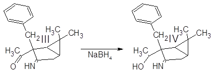 Авторы утверждают, что облучение енаминонов светом с длиной волны < 300 нм “can result in the formation of a variety of products… …photoreductions predominate”. Из приведенных литературных данных можно сделать выводы об условиях, необходимых для получения высоких выходов С-алкилированных производных енаминов, b-дикетонов и енаминонов: 1. Необходим подбор основности среды. В низкоосновных средах мала концентрация активного аниона и реакция протекает медленно, в слишком высокоосновной среде происходит депротонирование атома азота и преобладающим становится продукт N-алкилирования. 2. Упомянутые выше требования к кинетике процесса алкилирования должны быть удовлетворены в максимальной степени. 3. С-алкилированный продукт, получающийся при повышенных температурах, является следствием термодинамического контроля реакции реакции алкилирования, при снижении температуры реакции возрастает доля продуктов кинетического контроля -- N- и O-алкилированных продуктов. 4. Асимметрическая индукция от имеющихся структурных фрагментов может обеспечивать отмеченное многими авторами стереоселективное протекание реакции алкилирования [2, 3, 5, 11, 12, 14]. В целом можно отметить, что несмотря на широкую известность описанных соединений, реакции алкилирования с их участием изучены пока недостаточно. Экспериментальная часть.Синтез (3-амино-6,6-диметилбицикло[3.1.0]гекс-2-ен-2-ил)метилкетона II: К 350 мл спиртового раствора KOH при перемешивании в течение 10 мин. добавили 100 г кетонитрила I. Смесь нагрели и кипятили с обратным холодильником 15 мин., охладили и разбавили водой в три раза. Провели экстракцию смеси метилтретбутиловым эфиром (300, 300, 150 мл), эфирную фазу экстрагировали 1М HCl (900, 500, 300 мл). Полученный водный раствор нейтрализовали 30% аммиаком и экстрагировали tBuOMe (200, 200, 100 мл). Эфирный раствор высушили MgSO4 безв и отогнали растворитель. Выход 79%. Синтез (3-амино-2-бензил-6,6-диметилбицикло[3.1.0]гекс-2-ил)метилкетона III: 5 г енаминокетона II растворили в 30 мл бензола, в раствор добавили 15 мл 40% водного раствора NaOH и 0.5 г Bu4N+NO-3, перемешивали несколько минут и постепенно (3 мин.) добавили 10 мл бензилхлорида. Смесь интенсивно перемешивали 1.5 часа при 35-40˚С. Водную фазу отбросили, органическую экстрагировали 1М H2SO4 (15, 15, 15 мл). Экстракт нейтрализовали избытком 30% аммиака и экстрагировали метилтретбутиловым эфиром. Эфирный раствор высушили MgSO4 безв и отогнали растворитель. Выход 44%. Синтез 1-(3-амино-6,6-диметилбицикло[3.1.0]гекс-2-ен-2-ил)этанола: