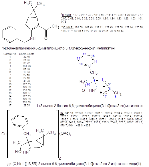 Показанные на схеме процессы обладают повторяемостью – по данным тонкослойной хроматографии в продуктах нескольких проведенных реакций набор компонентов один и тот же. Выходы выделенных веществ тоже примерно одинаковы. Спектры ядерного магнитного резонанса N-алкилированого продукта имеются в Приложениях. Его выход составляет 10%, но (!) – зимой. В тех же реакциях, осуществленных летом, продукт N-алкилирования зафиксирован не был. Предположение о связи направления алкилирования с температурой реакционной смеси (а в методике указана комнатная температура) подтвердилось – проведение реакции при 35ºС дало в качестве преобладающего продукта (с выходом ~60%) целевой С-замещенный енаминокетон, алкилирование прошло так, как описано в “летней” методике. Попытки дальнейшего повышения температуры пока не предпринимались. Полученный (3-амино-2-бензил-6,6-диметилбицикло[3.1.0]гекс-2-ил)метилкетон III был введен в реакцию с избытком боргидрида натрия для восстановлния карбонильной группы в спиртовую. Точный состав и строение комплекса IV неизвестны – парамагнитный ион меди II препятствует получению спектров ЯМР, по данным ИК-спектра что-либо определенное сказать затруднительно. Сводка полученных характеристик соединений дана ниже: