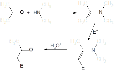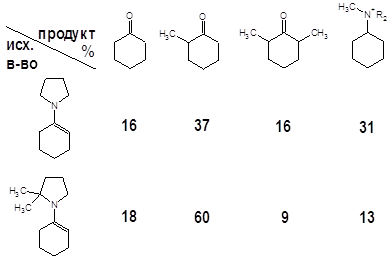 Скорости образования енаминов для различных вторичных аминов в большинстве случаев образуют следующий ряд: Условия протекания реакций алкилирования качественно одинаковы для всех рассматриваемых групп – щелочная среда или условия способствующие депротонированию α-углерода. Амминный атом водорода енаминов, также как Hα-С, в некоторой степени обладает кислотными свойствами, и в сильнощелочной среде реакция по гетероатому может конкурировать с основной. Особенно выделяются вторичные енамины, которые после N-депротонирования выступают как весьма активные N-нуклеофилы:
