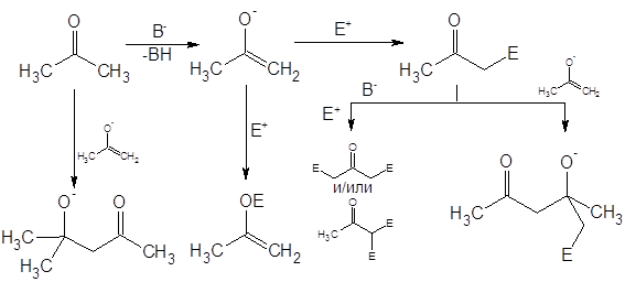 При их обработке электрофилом образуется от 10 до 70% N-замещенного продукта и многие авторы рассматривают C-алкилирование этих соединений лишь как побочную реакцию [3]. В целом, “семейство” побочных реакций для процессов нуклеофильного замещения довольно обширно, основные могут быть сведены в приведенную ниже схему (на примере енолятов) [4]: