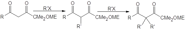 Даже с этими соединениями алкилирование кетонов через еноляты лития обеспечит высокий выход лишь для кетонов, устойчивых в сильноосновной среде (необходимой для генерирования енолятов). В случае β-дикетонов для депротонирования требуется менее основная среда. В работе [5] исследовано влияние пространственного строения бокового алкильного заместителя на скорость и региоселективность реакций алкилирования β-дикетонов: