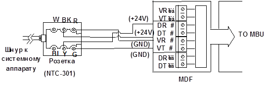 A. На плате MDFU расположены клеммы для подключения 6-и внешних линий базовой ёмкости: клеммы COT и COR . B. Подключение внешних линий к платам расширения (COB). a) отсоедините разъём от платы. b) подключите к разъёму провода внешних линий. c) установите разъём на плату. 3.5.8 АВАРИЙНОЕ ПЕРЕКЛЮЧЕНИЕ ЛИНИЙ Если к мини-АТС не подключена батарея резервного питания, то в случаях пропадания сетевого питания, максимум 3 внешних линии могут быть автоматически переключены на стандартные аппараты (SLT) для обеспечения аварийной связи. линия № 1 - Автоматически переключается на Тел. № 106 линия № 2 - Автоматически переключается на Тел. № 107 линия № 3 - Автоматически переключается на Тел. № 108 3.5.9 ПОДКЛЮЧЕНИЕ СИСТЕМНЫХ АППАРАТОВ Максимально к мини-АТС GHX-46 можно подключить 34 системных аппарата: 6 портов базовой ёмкости и 28 (4´7) - на платах расширения. Плата ETIB содержит 4 порта аналоговых системных аппаратов. Следует соблюдать осторожность, если подсоединение системных аппаратов производится при включенном питании мини-АТС. Для подключения системных аппаратов используется 4-проводный кабель (две витые пары). Первая пара проводов (VT, VR) обеспечивает прохождение речевого сигнала. Вторая пара проводов (DT, DR) предназначена для передачи цифровой сигнальной информации. Питание системного аппарата осуществляется по “фантомной” схеме, при этом по второй паре (DT, DR) подается напряжение питания + 24 В, а по первой паре (VT, VR) - “земля” (GND). Следует строго соблюдать полярность пары DT, DR. Изменение полярности не приводит к повреждению системы и аппарата, но не обеспечивает нормального функционирования.
