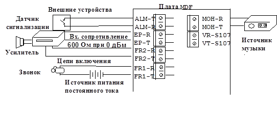 B. используя аудио аппаратуру (1) подключите внешнюю аудио аппаратуру к разъёму на MDF. (2) нажмите клавишу “MON” и наберите код записи сообщения (7*01-7*04) на аппарате № 100 (3) нажмите клавишу “2”. (4) нажмите клавишу HOLD для начала записи. (5) запишите сообщение, используя аудио аппаратуру. (6) нажмите клавишу HOLD для окончания записи. 2.5.6 НАЗНАЧЕНИЕ КЛЕММ НА ПЛАТЕ MDF Все подключения к плате MDFU выполнены “под винт”, за исключением входа внешнего музыкального источника. Рисунок 2.2. Назначение контактов кроссировочной платы MDF 2.5.7 ПОДКЛЮЧЕНИЕ ВНЕШНИХ ЛИНИЙ (CO/PBX)