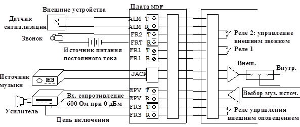 Рисунок 1.7 Аварийное переключение линий 1.5.9 Подключение ПЕРЕГОВОРНОГО УСТРОЙСТВА (домофона) Переговорное устройство (домофон) позволяет осуществлять внутреннюю связь посредством встроенного спикерфона, и обеспечивает пользователя возможностью вызывать заранее запрограммированный аппарат нажатием кнопки “CALL”, а также принимать внутренние вызовы и объявления по громкой связи (оповещение). Устройство должно быть установлено в месте, защищенном от внешних воздействий, где требуется обеспечить оповещение или контроль доступа. Каждый домофон подключается к станции индивидуальным кабелем. Переговорные устройства должны быть подключены к системным портам мини-АТС аналогично системным телефонам. a) Откройте корпус с помощью тонкой плоской отвертки, нажимая на защелку. b) Установите заднюю крышку домофона на стену и закрепите её двумя шурупами. c) Вставьте кабель через отверстие в нижней панели корпуса переговорного устройства. Подключите кабель к клеммам, расположенным в нижней части печатной платы домофона. Подключение производите в соответствии с цветовыми обозначениями клемм домофона и маркировкой контактов системного порта на панели MDF: GR - контакт VT, RD - контакт VR, BL - контакт DT, YL - контакт DR. d) Излишек кабеля следует вытянуть обратно из корпуса домофона через отверстие в нижней панели и закрепить его. Присоедините корпус домофона к задней крышке и закрепите с помощью защелки. 1.5.10 Подключение внешнего вызывного устройства Система GHX-308A обеспечивает замыкание контактов реле на время вызова, для обеспечения подключения внешнего устройства громкого вызова. Аппарат, вызов которого включает внешнее вызывное устройство, назначается при программировании станции (FLASH 23). Внешнее вызывное устройство подключается к контактам FR 1T/1R, 2T/2R на системной плате. Коммутируемая мощность контактов: 120 В, 500 мА переменного тока (24 В, 1 А постоянного тока). См. рисунок 1.8 Подключение дополнительных устройств. 1.5.11 Подключение внешнего устройства оповещения Станция GHX-308A обеспечивает подключение внешнего усилителя для системы оповещения. Выходное сопротивление порта оповещения - 600 Ом (при уровне 0 дБ), максимальная выходная мощность 5 мВт. Пара контактов E.PAGE T/R, расположенная на плете MBU, является выходом порта внешнего оповещения и служит для передачи речевого сигнала. При необходимости управления питанием аппаратуры оповещения могут быть использованы контакты реле FR #T/#R, которые обеспечивают включение внешнего усилителя на время объявления по громкой связи. Коммутируемая мощность контактов: 120 В, 500 мА переменного тока (24 В, 1A постоянного тока). См. рисунок 1.8 Подключение дополнительных устройств. 1.5.12 подключение музыкального источника Мини-АТС поддерживает такие сервисные функции, как музыка в режиме удержания линии (MOH) и фоновая музыка для прослушивания посредством громкоговорителя системного аппарата. Возможно использование либо внутреннего музыкального источника (микросхема с записанной мелодией) либо внешнего (тюнер, магнитофон и др.). Выбор музыкального источника производится установкой перемычки “CN225” на системной плате. При поставке системы заводская установка соответствует внутреннему источнику, если Вы хотите использовать внешний источник, переключите перемычку “CN225” из положения “INT” в положение “EXT”. Внешний музыка