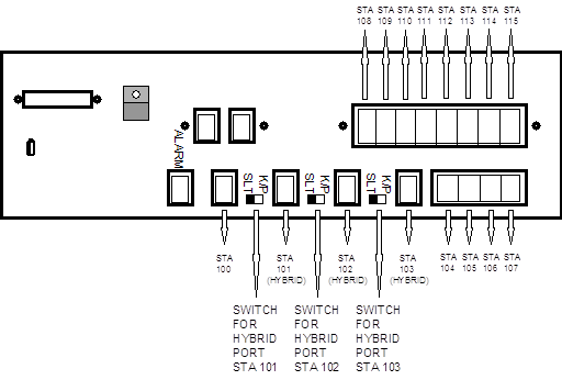 Порты №№ 101 - 103, расположенные на основной системной плате (MBU), являются универсальными (гибридными). К этим портам допускается подключение как системного (KTU), так и стандартного однолинейного аппарата (SLT). При установке системного аппарата, переключатель типа порта необходимо перевести в положение “K/P”. В случае установки стандартного аппарата, переключатель типа порта необходимо перевести в положение “SLT”. Примечание : Если положение переключателя не соответствует типу подключенного аппарата, то это может привести к ухудшению качества звука.
