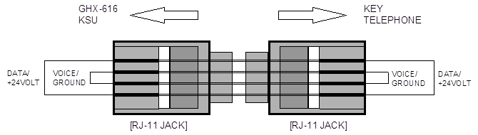 Рисунок 2.3 Подключение внешних линий 2.13 Подключение телефонных аппаратов A СИСТЕМНЫЕ АППАРАТЫ К мини-АТС GHX-616 могут быть подключены 4 системных аппарата в базовой конфигурации и 8 дополнительных системных аппаратов при установке в систему платы расширения CKIB. Для подключения системных аппаратов используется 4-проводный кабель (две витые пары) с разъёмом RJ-11. Первая пара проводов (VOICE) обеспечивает прохождение речевого сигнала. Вторая пара проводов (DATA) предназначена для передачи цифровой сигнальной информации. Питание системного аппарата осуществляется по “фантомной” схеме, при этом по второй паре (DATA) подается напряжение питания +24 В, а по первой паре (VOICE) - “земля” (GROUND). Необходимо обеспечить правильное подключение системных аппаратов в соответствии с нижеследующим рисунком. При подключении пары “DATA” требуется соблюдать полярность. Изменение полярности не приводит к повреждению системы и аппарата, но не обеспечивает нормального функционирования.