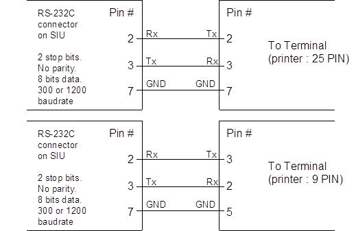 Рисунок 3.3 Подключение дополнительного оборудования. 3.5.13 Подключение внешнего устройства оповещения Станция GHX-46 обеспечивает подключение внешнего усилителя для системы оповещения. Выходное сопротивление порта оповещения - 600 Ом (при уровне 0 дБ), максимальная выходная мощность 5 мВт. Коммутируемая мощность контактов: 125 В, 500 мА переменного тока (32 В, 2А постоянного тока). Контакты FR3-T и FR3-R обеспечивают включение внешнего усилителя. Пара “EP-VT, EP-VR” служит для передачи речевого сигнала. См. рисунок 3.3 Подключение дополнительного оборудования. 3.5.14 подключение музыкального источника Мини-АТС поддерживает такие сервисные функции, как музыка в режиме удержания линии (MOH) и фоновая музыка для прослушивания посредством громкоговорителя системного аппарата. Возможно использование либо внутреннего музыкального источника (микросхема с записанной мелодией) либо внешнего (тюнер, магнитофон и др.). Выбор музыкального источника (внутренний/внешний) производится установкой перемычки “CN44” на системной плате в требуемое положение: “INT”/“EXT”. При поставке системы заводская установка перемычки “CN44” соответствует внутреннему источнику, если Вы хотите использовать внешний источник, переключите перемычку “CN2” из положения “INT” в положение “EXT”. См. рисунок 3.3 Подключение дополнительного оборудования. 3.5.15 ПОДКЛЮЧЕНИЕ СИГНАЛИЗАЦИИ Мини-АТС GHX-46 позволяет транслировать сигнал тревоги от внешней системы сигнализации на любой указанный при программировании системный аппарат (исключая переговорное устройство). Контакты датчика сигнализации могут быть нормально разомкнуты или нормально замкнуты. Условие срабатывания сигнализации задается при программировании системы (замыкание/размыкание). Сигнал тревоги может быть однократным или продолжительным (выбирается при программировании). Датчик сигнализации подключается к клеммам ALM-T и ALM-R на плате MDF. См. рисунок 3.3 Подключение дополнительного оборудования. 3.5.16 ПОДКЛЮЧЕНИЕ МОДУЛЯ SIU В систему может быть дополнительно установлен один модуль SIU, содержащий стандартный порт RS-232C. Модуль SIU используется для распечатки отчета регистрации вызовов (SMDR) и базы данных системы. Формат строки печати отчета SMDR - 80 или 29 символов в строке. Разводка разъёма RS-232C показана на Рисунке 3.4 Подключение RS-232C. Рисунок 3.4 Подключение RS-232C. 3.5.17 Подключение головных телефонов (гарнитуры оператора) Системные телефоны могут быть оборудованы стандартными адаптерами головных телефонов. Для использования гарнитуры подключите адаптер к разъёму вместо телефонной трубки. В программе FLASH 40 необходимо запретить использование спикерфона (встроенного микрофона). После этого невозможно выполнение операций на телефонном аппарате без снятия трубки: такие функции, как “Набор номера без снятия трубки” и “Автоматический ответ в режиме громкой связи” (Handsfree), будут недоступны для пользователя. Однако, входящие звонки, оповещение, сигнал вызова и музыка в фоновом режиме будут слышны на громкоговорителе аппарата. Клавиша контроля MON в этом случае будет управлять состоянием трубки (снята или положена). 3.5.18 ПОДКЛЮЧЕНИЕ БАТАРЕИ АВАРИЙНОГО ПИТАНИЯ Для обеспечения бесперебойного режима работы системы в случаях аварии сетевого электропитания рекомендуется подключить блок аккумуляторных батарей на 24 В ( обычно две батареи по 12 В) с 