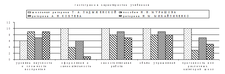 ( 30; 57 – 58 ) 2. 5. ВОЗМОЖНОСТЬ ИСПОЛЬЗОВАНИЯ УЧЕБНИКОВ РИТОРИКИ В РАЗНЫХ КАТЕГОРИЯХ ШКОЛ. Теперь мы попробуем дать краткую характеристику описанным выше учебным пособиям. Н. А. МИХАЙЛИЧЕНКО. РИТОРИКА. Это довольно неплохой учебник с хорошими заданиями, но, на наш взгляд, он написан языком, который скорее будет понятен преподавателю, нежели учащимся. Изобилие сложных фраз ещё не является показателем педагогической грамотности составителя учебника. Нам не понравилось, что автор взял за определение риторики лишь одну её сторону - ораторское искусство , т е. учебник призван готовить ораторов. Поэтому мы считаем, что курс Н. А. МИХАЙЛИЧЕНКО правильнее было бы назвать " МАСТЕРСТВОМ ПУБЛИЧНОГО ВЫСТУПЛЕНИЯ ". В таком случае, его не имеет смысла разбивать на несколько лет, а в целях лучшего усвоения включить в программу одного года ( какого - зависит от развития и успеваемости коллектива ). Как и указано самим автором, этот курс можно ввести лишь в специализированных учебных заведениях: гимназиях, лицеях, школах с гуманитарным профилем ), т. к. для других он будет сложен. И в этом мы видим большой " - " составителя, потому, что уметь убеждающе говорить и просто уверенно выражать свои мысли должны все. Н. Н. КОХТЕВ. РИТОРИКА. " Риторика " Кохтева, как и " Риторика " Михайличенко, направлена на развитие ораторского мастерства учащихся, при чём учащихся специализированных школ, гимназий и лицеев. Но это более обстоятельное пособие, чем предыдущее. Теория здесь достаточно основательно подкреплена примерами - блестящими образцами красноречия. Опорные схемы - не новый, но очень помогающий приём. Обилие разнообразных упражнений - тоже " + " пособию. Язык " Риторики " Кохтева будет понятен учащимся, а возможная разбивка преподавателем одной главы на уроки по количеству вопросов в ней поможет лучше разобраться в материале. Учебник удобен тем, что позволяет изучать ораторское искусство и самостоятельно. На это же рассчитаны и возможные ответы на вопросы в конце пособия. Обилие разнообразных вопросов и заданий направлено на формирование у учащихся навыков анализа и самоанализа. " Минус " - узконаправленность понимания риторики и круга учебных заведений, где она может преподаваться. А. А. МУРАШОВ. ОСНОВЫ ПЕДАОГИЧЕСКОЙ РИТОРИКИ. Это учебное пособие полностью оправдывает своё предназначение - помощь в коммуникативной лингвистике и риторике учителям и студентам вузов ( готовящимся в учителя ). Все задания, весь материал посвящён лишь указанной выше цели. Пособие очень ценно, тем более, что педагог - риторик может воспользоваться им как дополнительным ( в некоторых темах ), и для работы в школе, т. к. в нём немного раскрыты и такие важные темы, как диалог и речевой этикет. ( В предыдущих учебниках этого не было .) Пособие может стать настольной книгой молодого учителя любого предмета ( к чему и стремился автор книги ). Один из " минусов " пособия - недостаток примеров и средств наглядности. Т. А. ЛАДЫЖЕНСКАЯ. " ШКОЛЬНАЯ РИТОРИКА ". V КЛАСС. Учебник Т. А. ЛАДЫЖЕНСКОЙ, на наш взгляд, на сегодняшний день является самым лучшим из всех имеющихся. Он разнопланов и разнонаправлен. Задумка авторов - серия учебников с I – по XI класс - позволяет вырастить грамотное поколение, умеющее общаться и вести себя, избавленное от косноязычия и слов – паразитов. Учебник Ладыженской лёгок в усвоении. Уча