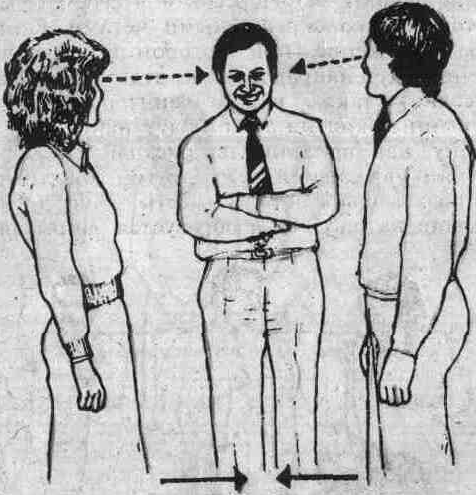 Когда мы адресуемся к большой группе людей, то удобнее всего стоять именно на этом расстоянии от аудитории. Практическое использование зонального пространства. Обычно наша интимная зона нарушается тем или иным человеком по двум причинам. Первая – когда «нарушитель» является нашим близким человеком или же человеком, имеющим сексуальные намерения. Вторая – когда «нарушитель» проявляет враждебные тенденции и склонен атаковать нас. Если мы можем терпеть вторжение посторонних людей в наши личные и социальные зоны, то вторжение постороннего человека в интимную зону вызывает внутри нашего организма различные физиологические реакции и изменения. Сердце начинает биться быстрее, происходит выброс адреналина в кровь и она приливает к мозгу и мышцам как сигнал физической готовности нашего организма к бою. Это означает, что если Вы дружелюбно прикоснетесь к руке или обнимите человека, с которым Вы только что познакомились, то это может вызвать у него отрицательную реакцию по отношению к Вам, даже если он будет Вам улыбаться и, чтобы не обидеть, делать вид, что это ему нравится. Если Вы хотите, чтобы люди чувствовали себя в Вашем обществе уютно, соблюдайте золотое правило: «Держи дистанцию». Скученность людей на концертах, в кинозалах, в транспорте, лифте приводит к неизбежному вторжению людей в интимные зоны друг друга. Существует ряд неписанных правил поведения человека в условиях большой скученности людей, например в автобусе или лифте: