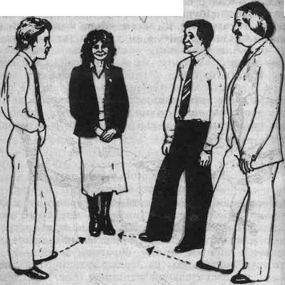 Из всех зон эта самая главная, поскольку именно эту зону человек охраняет так, как будто бы это его собственность. Разрешается проникнуть в эту зону только тем лицам, кто находится в тесном эмоциональном контакте с ним. В этой зоне имеется еще подзона радиусом в 15 см., в которую можно проникнуть только посредством физического контакта. Это сверхинтимная зона.Личная зона (46см – 1,2 м.)Это расстояние, которое обычно разделяет нас, когда мы находимся на вечеринках или официальных приемах.