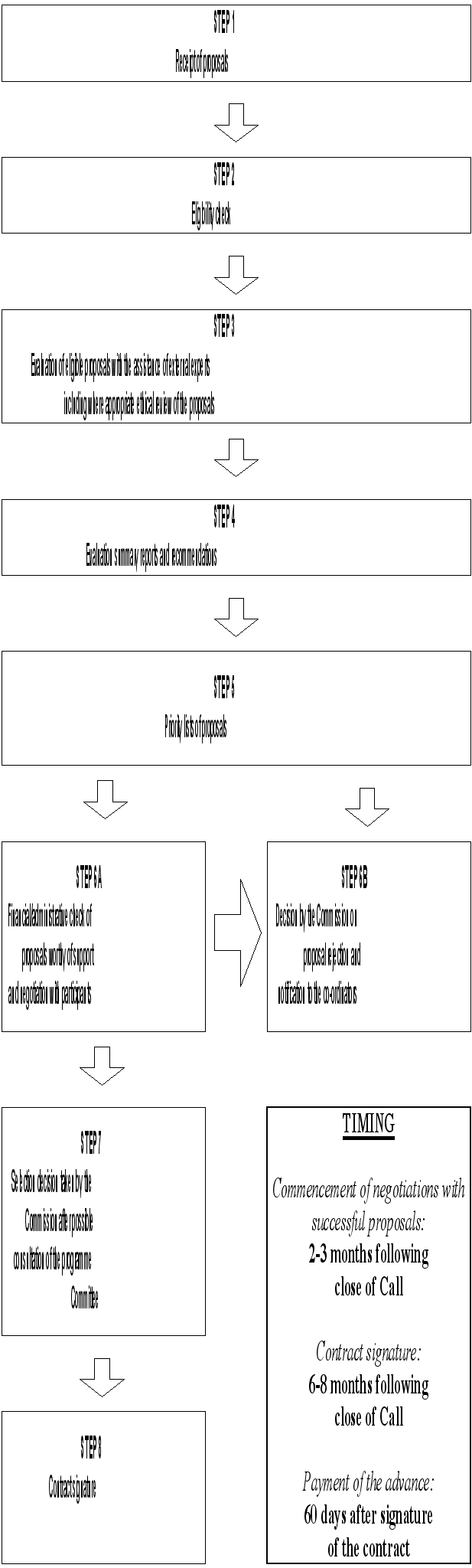 III.3. Proposal evaluationIII.3.1. General principlesThe evaluation of proposals will be based on the fundamental principles of transparency and equality of treatment. The entire selection process and the description of the criteria by which the proposals will be evaluated are presented in the Evaluation Manual (see also box 5 and Appendix 6 of Part 2 of this Guide). In general, and in order to help the Commission, panels of independent, external experts16 will be constituted covering a wide range of relevant expertise, without linguistic or geographic bias. Proposers’ confidentiality will be fully respected, both to avoid conflicts of interest and to preserve the impartiality of the independent experts. III.3.2. Conformity check and eligibilityOn receipt, all proposals will be subject to a validation process, to ensure they conform to the requirements of the Call, of the submission procedure and of the rules for participation. Only proposals that conform to these requirements will be subject to evaluation. III.3.3. EvaluationProposals will be evaluated according to criteria grouped into five categories, as laid down in the Work Programme applicable to the relevant call. The content and the respective weighting of the criteria are described in the Evaluation Manual. Programme specific information on evaluation may also be explained, if appropriate, in Part 2 of this Guide. Ethical aspects and safety aspects have to be taken into account in the process. The experts examine proposals individually, then meet as a panel to agree a ranking. At this stage, they may recommend that certain proposals should be combined into larger projects or linked together as clusters (see section I.3.3). Following the evaluation, and according to the interest of Community, the Commission will establish a list of proposals in order of priority. This list will take into account the budget available (which has been set out in the call for proposals) plus, if necessary, a percentage of the call budget to allow for withdrawal of proposals and/or savings to be made during contract finalisation. Late or ineligible proposals, those of inadequate quality or for which there is not adequate budget will be subject to a “non-retained” decision by the Commission. This information, with the main reason for non-retention, will be communicated to the proposers concerned. III.4. Proposal selectionThe co-ordinators of proposals, which have been retained, will be notified in writing. This notification however does not ultimately commit the Commission to fund the project concerned. A brief report on the evaluation prepared by the Commission will be sent to the proposers via the proposal co-ordinator. Further administrative and financial information will be required to assess the viability of the proposed project. Hence, participants will have to demonstrate that they have all the necessary resources17 needed for carrying out the project. The Commission will check these, and may seek to safeguard its interest by asking for a bank guarantee or by other measures. The Commission may also propose modifications to the original proposal based on the result of the evaluation, or in terms of grouping or combination with others. On successful conclusion of these negotiations, the Commission will then offer contracts for the commencement of work, based on a timetable determined by the needs of the Specific Programme concerned. Any proposal, which is finally not taken up, due to a lack of available funding for example, will be subject to a “non-retained” decision by the Commission. This information, with the main reason for non-retention, will be communicated to the proposers concerned. III.5. The contractContracts are issued to proposals successful in the procedure of selection. III.5.1. The various types of contractsResearch contracts from the Commission fall into five main groups. They each have their own detailed conditions, appropriate to the types of action and the activities to which they refer. (see boxes 6, 7 and 8). III.5.2. The subject of the contractThe main obligation of the participants is to carry out the project to completion in a pre-arranged period, and to make use of or disseminate its results. In return, the Commission undertakes to contribute financially to the realisation of the project, normally by reimbursing a certain percentage of the project costs18. III.5.3. Rights and obligations of participantsThese may vary according to the nature of the action or the category of participant:
