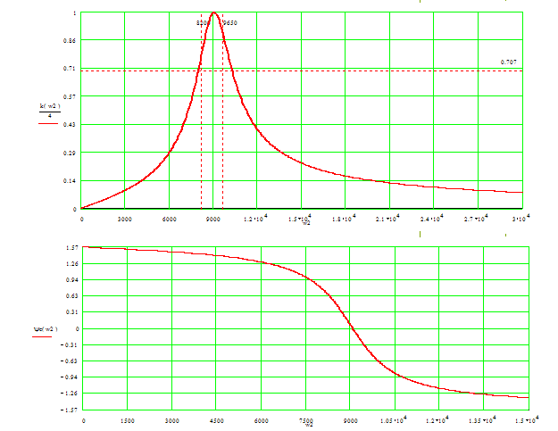 2. Для убеждения в правильности расчёта схемы, расчёты также проводились в программе “Mathcad”. В результате были получены зависимости АЧХ и ФЧХ от частоты, изображенные на рис. 5.
