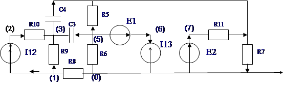 E1= 7.5 мВ; E2= 7.125 мВ; R5= 8.5 кОм; R6= 40 кОм; R7= 12 кОм; R8= 4 кОм; R9= 1.3 кОм; R10= 2.8 кОм; R11= 700 Ом; I12= 5 мА; I13= 0.5 мА. 2. Формирование уравнений математической модели фильтра. Более универсальным в задачах исследования, разработок является метод переменных состояния, отличительной особенностью и достоинством которого является возможность получения ММ в так называемой форме Коши (уравнения относительно производных), что позволяет использовать базовые программы математического обеспечения ЭВМ. Метод переменных состояний является базовым методом в САПР устройств, систем, сетей радиосвязи. Суть метода состоит в том, что анализируемая RLC- цепь может представлена в виде: пассивной линейной R-цепи из которой выносятся реактивные элементы и независимые источники входных воздействий. Далее реактивные элементы и независимые источники представляются, как вектор состояния X(t) и вектор воздействия Xни(t) анализируемой цепи. Тогда полная система уравнений математической модели анализируемой цепи будет иметь вид: Iрез(t)=В1X(t)+B2Xни(t) (I), dX(t)/dt=P1(t)+P2Xни(t) (2), Xвых(t)=Dl X(t)+ D2Xни(t) (3), где (1) - уравнение токов резистивных элементов, Bl, B2 -матричные коэффициенты, значение которых определяется топологией и сопротивлениями резистивных элементов R-цепи. (2) - уравнение состояния, Р1,Р2-матричные коэффициенты, значения которых зависит от топологии цепи и параметров ее элементов; (3) - уравнение выхода в котором скаляр Хвыx.(t) обозначает напряжение Uвых. либо ток Iвых. для выделенного при анализе выхода схемы, а коэффициенты D1,D2 определяются данными схемы. Алгоритм решения системы (1) - (3) основан на следующей последовательности действий: · первоначально решаются уравнения (2) (при этом порядок уравнения, то есть число уравнений, объединенных в матричное выражение (2), определяется числом элементов вектора Х); · по найденному значению Х рассчитывается вектор Iрез. из уравнения (1); · для известных значений Х и Iрез. находится значение скаляра Хвых(t).