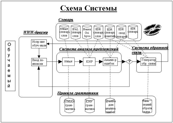 Рисунок 1 Схема системы Система обратной связи и исправление обучаемым Информация об ошибках поступает на систему обратной связи от системы анализа предложений в виде кода ошибки. Адекватные сообщения обратной связи выдаются в соответствии с кодом ошибки. В этой системе авторы предлагают механизм исправления ошибок обучаемым, позволяющий обучаемому лучше понять те ошибки, которые он совершил. «Исправление обучаемым» означает, что когда анализатор ошибок обнаруживает ошибку, обучаемому выдается не готовый ответ, а соответствующее введенному предложению сообщение обратной связи. Обучаемый может или прочитать сообщение обратной связи сразу и исправить введенное предложение, или он может обратиться к грамматическим темам, освещающим его ошибку и исправить предложение позже. Сообщения обратной связи с каждым исправлением становятся более детальными. Например, если это ошибка в спряжении глагола, то будет выдано примерно такое сообщение обратной связи «Ошибка в глаголе», и несколько примерно таких ссылок «Таблица глаголов», «Практика спряжения глаголов», «Что такое страдательный залог» и т.п. - внизу сообщения. Обучаемый может обратиться к этим грамматическим темам и исправить ошибку самостоятельно. Конечно же, предложение можно исправить и непосредственно после выдачи сообщения обратной связи. Рисунок 2 иллюстрирует сообщения обратной связи о неправильном спряжении глагола в страдательном залоге.