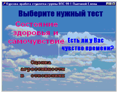 Рисунок 1. 1 – Первое окно программы (форма frmMain) Здесь, на фоне неба как-бы «висят» названия тестов. При движении курсора мышки по кнопке, она приподнимается над общим фоном, как показано на рис. 1.1 Щелкнув левой кнопкой мыши, тестируемый выбирает интересующий его тест и попадает в окно тестирования, показанное на рис. 1. 2, стр. 10. Чтобы ответить на вопрос, достаточно щелкнуть на правильном с точки зрения пользователя варианте ответа (при этом все варианты тут-же заблокируются и станет доступной кнопка «Далее»). Для перехода к следующему вопросу надо нажать кнопку «Далее».