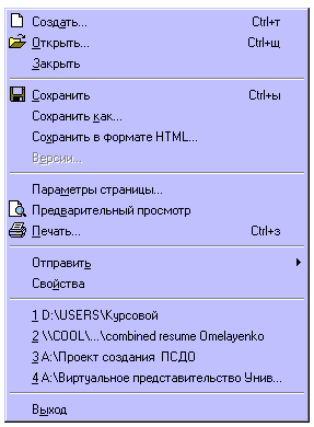 Эту «примочку» используют в основном для отдления различных типов действия, вызываемого меню, например, часто в меню «Файл» помещают список нескольких открывавшихся ранее файлов, отделенный от остального меню такими линиями. Прекрасным примером использования разделительных линий также может служить меню «Файл» программы Microsoft Word. Оно приведено для наглядности на рис. 2. 6.
