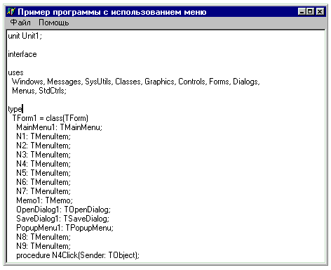 Как видно из рис. 1. 4, текст результата вводится в окне ввода типа Memo. В верхние спинэдиты помещается минимальное и максимальное количесиво очков, которые должен набрать тестируемый, чтобы высветился именно этот вариант результатов. Спинэдит «Вариант № » показывает, над каким вариантом результата ведется работа. Кнопки «Сохранить» и «Загрузить» вызывают стандартные диалоговые окна Windows для, соответственно, сохранения и загрузки файла результатов. Сохраняя файл результатов, желательно давать ему расширение RTS. 2 Система меню Среда программирования Borland Delphi имеет два компонента для создания меню: TMainMenu и TPopupMenu. Они делают программирование меню приложений несложной задачей. В данной курсовой работе будут описаны способы создания меню с обеими компонентами, а также представлены примеры программ. 2. 1 TMainMenu