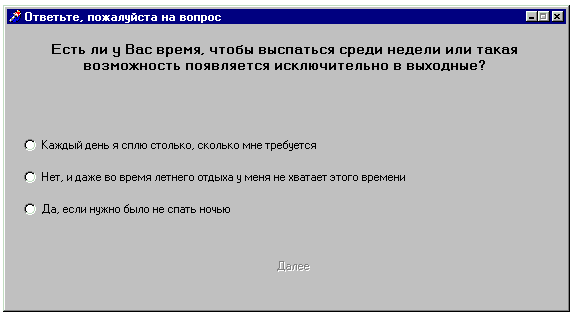 Подобно информации о тестах, информация результатов тоже хранится в записях. Тип называется TResult: TResult=record min,max:integer; {кол-во баллов} text:array[1..1000] of char; {текст результата} end; Подобно вопросам, результаты хранятся в массивах; для сохранения на диске используются типизированные файлы. 1. 1. 3 Описание работы программыНа форме frmMain размещены кнопки SpeedButton, у которых свойство Flat установлено в «истину». Благодаря этому они прозрачны. Надписи, которые находятся на этих кнопках, на самом деле взяты из графических файлов. Нажатие на любую кнопку вызывает соответствующий обработчик события, который, в свою очередь, присваивает глобальной переменной testfilename:string, описанной в модуле TestTypes, имя файла теста, а потом запукает процедуру RunTest, показывающую форму frmTest. Дальше работают процедуры модуля этой формы. Процедура Load, описанная как метод, загружает из файла теста очередной вопрос с вариантами. Обработчик события нажатия кнопки «Далее» проверяет наличие еще вопросов в файле и в случае позитивного ответа вызывает Load, в противном случае – грузит из файла результатов нужную запись в Label1 формы вывода результатов frmRes. После этого прячет окно тестирования и показывает результат. Устройство программ создания тестов и результатов не нуждается в описании. 1. 1. 4 Инструкция для пользователяИсполняемый файл программы называется SuperPsy.еxe. Запустив его, пользователь увидит окно, приглашающее выбрать нужный тест. Это окно показано на рис. 1. 1