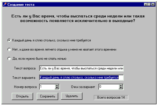 При запуске вместо текста вопроса написана строка «Текст вопроса», а вместо вариантов ответов – «Вариант1 (2,3)». Мышкой можно выбирать «радиобаттон», а потом вводить в поле «текст варианта» нужный вариант.