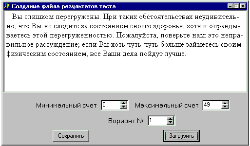 Для хранения информации теста (тексты вопросов, варианты ответов и т. п.) используется пользовательский тип TTest: TTest=record text:string[255]; {текст вопроса} quest:array[1..3] of string[100]; {варианты} count:array[1..3] of byte; {очки за вариант} end; В такой записи хранится один вопрос. Весь тест содержится в массиве записей. При сохранении теста на диске используется типизированный файл этого типа. Программа создания тестов – TestCreator тоже использует этот тип. 1. 1. 2 Хранение информации для возврата результов теста