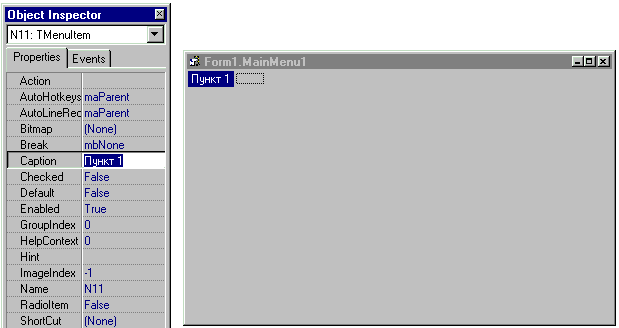 На рис. 2.1 показано окно для ввода пунктов меню, а также часть инспектора объектов со свойством Caption, которому нужно присвоить строку меню. Кроме того, можно изменить свойство Name. 2. 1. 1 СобытияЧтобы программа реагировала на выбор пункта меню, нужно создать специальный обработчик события, который будет вызываться каждый раз при щелчке мышки по пункту или при нажатии клавиши «ENTER». Вставить обработчик события выбора меню можно несколькими способами: двойной щелчек по пункту на окне редактирования меню, на форме; можно, в крайнем случае, назначить событие на странице «Events» инспектора объектов. 2. 1. 2 Вложенные менюТакие меню широко применяются во многих приложениях Windows и не только. Выбирая пункт меню, пользователь попадает в другое меню (как правило, расположенное вертикально) и может выбирать там. После ввода пункта горизонтального меню, оно принимает вид: