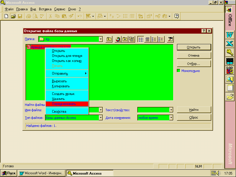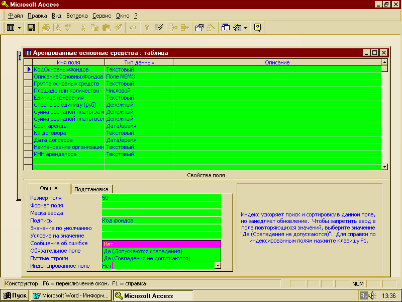 Задание 3. Редактирование базы данных Перейдя в режим таблицы, начинают ввод информации в каждом поле. Чтобы перейти из одного поля в другое или в следующую запись (которая автоматически создается при начале ввода записи), надо нажать Tab, Enter или клавиши управления курсором на клавиатуре. При необходимости ввести дополнительное поле достаточно установить курсор в поле, перед которым нужно разместить новое, и выполнить команду меню Вставка/ Столбец. Новый столбец будет автоматически назван Поле1 с типом данных Текстовый. Изменить тип данных можно в режиме конструктора таблиц. Копирование или перемещение записей в таблице начинают с выделения записи или записей. Выделить запись можно с помощью мыши, щелкнув левой кнопкой по прямоугольнику с левого края строки, а снять выделение можно нажатием кнопки Отмена на панели инструментов или, просто, установив курсор в любой записи. Для того чтобы скопировать записи, нажимают на панели инструментов кнопку Копировать. Для перемещения записей нажимают там же кнопку Вырезать. Для замены записей копируемыми записями, надо выделить заменяемые записи и нажать на панели инструментов кнопку Вставить. Для добавления записей в конец объекта в режиме таблицы выбирают в меню Правка команду Добавить из буфера. Удаление записи осуществляется аналогично. Выбирают удаляемую запись, а затем нажимают на панели инструментов кнопку Удалить запись. Удаление нескольких записей можно осуществить с помощью запросов удаления. На вкладке Запросы можно Создать в режиме конструктора запрос, при этом на панели инструментов с помощью кнопки Тип запроса выбирается Удаление, после чего устанавливается условия удаления. Задание 4. Копирование баз данных и файлов Часто создавая новые таблицы или базы данных, легче воспользоваться уже готовыми формами, чем каждый раз заново формировать структуру таблицы. Именно такая возможность предоставляется Access при создании таблицы новой базы данных в режиме импорта таблиц. В этом режиме последовательно выбирают базу данных и таблицу, откуда импортируют, и параметры – полное копирование или только структуры. Но проще, скопировав таблицу в буфер, затем вставить её в новую базу данных. Процедура копирования и вставки изложена в предыдущем задании. При вставке Access запрашивает параметры – полное, только структура, только данные. Есть и возможность не импорта, а экспорта таблицы – это в меню Файл выполнить команду Сохранить как/ экспорт и в открывшемся окне диалога выбрать адрес экспорта, имя новой таблицы. Если надо перенести в новую базу данных часть записей из старой базы, то сначала выделяют и копируют нужные записи, а потом в новой базе данных вставляют их, предварительно выделив место вставки (хотя бы одну запись).