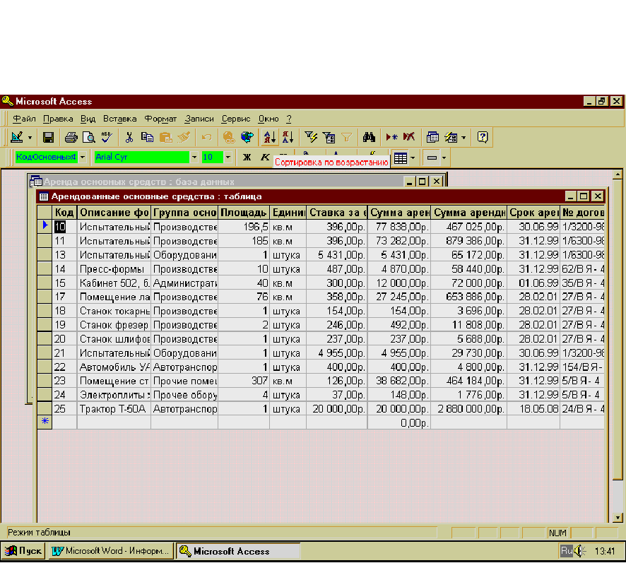 Задание 6. Разработка отчётов средствами MS Access Разработка отчетов с помощью Access осуществляется без больших усилий. В окне базы данных на вкладке Отчеты нажимают на кнопку Создать и в появившемся окне выбирают вариант создания отчета. Для простого отчета можно использовать вариант Автоотчет, но самый удобный режим – Мастер отчетов. В нем можно легко и полностью определить вид отчета, - поля, порядок сортировки и группировки записей, выбрать стиль отчета, установить вид вычислений по числовым полям. Для того, чтобы вывести не все записи, а только отвечающие определенному условию, надо предварительно сделать запрос с этим условием и уже на его основе сформировать отчет. Задолженность арендаторов производственного оборудования Наименование организации-арендатора НПФ "Истра" Описание фондов Срок аренды Сумма арендной платы за месяц Сумма арендной платы всего Пресс-формы 31.12.99 4 870,00р. 58 440,00р. Итоги по НПФ "Истра" 4 870,00р. 58 440,00р. Наименование организации-арендатора ООО "Электром" Описание фондов Срок аренды Сумма арендной платы за месяц Сумма арендной платы всего Станок шлифовальный 28.02.01 237,00р. 5 688,00р. Станок фрезерный 28.02.01 492,00р. 11 808,00р. Станок токарный Т-6890 28.02.01 154,00р. 3 696,00р. Итоги по ООО "Электром" 883,00р. 21 192,00р. ИТОГО ИТОГО 5 753,00р. 79 632,00р. 22 ноября 1999 г. Страница 1 Задание 7. Разработка командных файлов (Элементы программирования) При создании командного файла использовалась Foxpro 2.6 type contr wait window 'установка' set talk off set date german clear wait window 'открытие базы данных' use arenda list for group='производственное оборудование' wait window 'вывод на печать' list for group='производственное оборудование' to print use return do contr